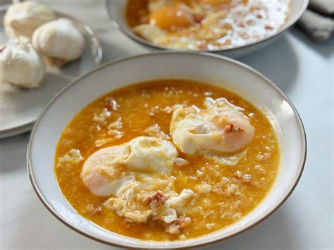 Sopa de ajo servida con huevo poché, una variante popular.