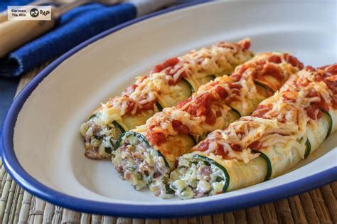 - Coloca los Canelones en una bandeja y la bechamel de calabacín por encima. Los podéis hacer de dos formas diferentes con placas para canelones o formar el canelón con láminas de calabacín.