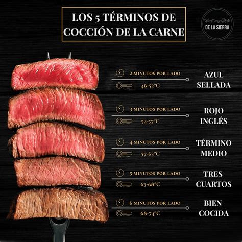 Guía de temperaturas internas para diferentes puntos de cocción de la carne.