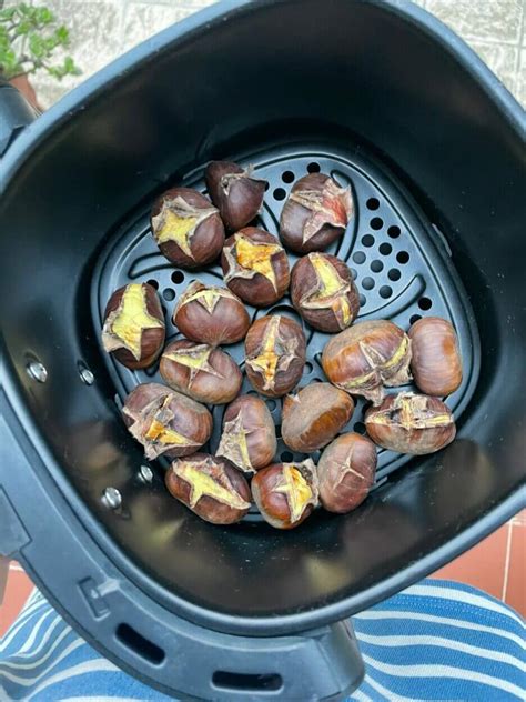 Después de hacer las rajas en las castañas las pondremos en la freidora de aire y programaremos la misma a 200º Centígrados durante 15 minutos. Cada 5 minutos sacaremos el contenedor con las castañas y las removeremos.