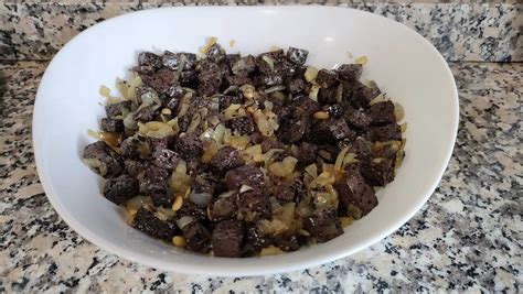 - Sofrito de cebolla y sangre: Calienta cuatro o cinco cucharadas de aceite en una sartén. Añade la cebolla picada y sofríe a fuego medio hasta que esté ligeramente dorada. Agrega la sangre y cocina hasta que esté dorada por ambos lados.