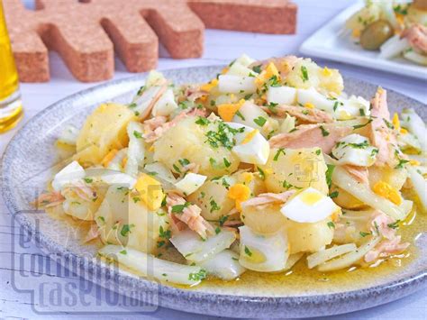 Ensaladas de patatas hay muchas, desde la tradicional ensalada campera hasta la sorprendente ensalada de patata alemana. La que vamos a preparar hoy, sin embargo, es una receta muy sencilla que no responde a una única forma de elaboración. Se trata de una ensalada de patatas que nos gusta mucho, con una combinación de ingredientes muy sencillos a base de patatas cocidas con tomate, cebolleta, aceitunas rellenas, atún y huevo hervido.