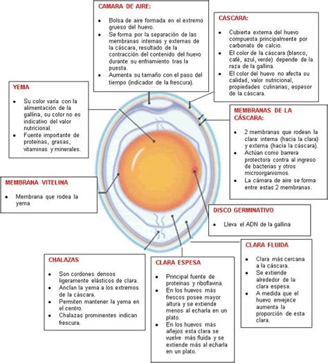 El contenido comestible del huevo lo forman la clara y la yema. La clara contiene principalmente agua (88%) y proteínas, de las que la albúmina es la más importante. En la yema el 50% es agua, y el resto se reparte equitativamente entre proteínas y lípidos. Dada la variabilidad de tamaño de los huevos, para las estimaciones de valor nutricional del huevo consideraremos un huevo de tamaño mediano (categoría de peso M, entre 53 y 63 g de peso total, y 50 g de parte comestible).