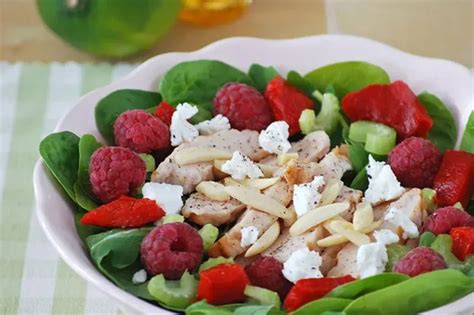 Ingredientes: 170 g de pollo asado o cocido, 50 g de espinacas frescas, 50 g de rúcula o canónigos, 100 g de frambuesas, almendra laminada al gusto, 2 medallones de rulo de queso de cabra, 1 pimiento rojo asado o de piquillo, 1 rama de apio, 30 ml de aceite de oliva virgen extra, 2,5 ml de vinagre de Jerez o manzana, el zumo de dos limas y media, pimienta negra molida y sal.