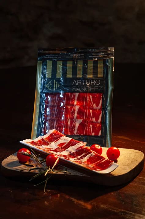 - Para terminar con la preparación del plato, utilizaremos el ingrediente estrella de esta receta: el jamón ibérico de bellota Arturo Sánchez. Para ello, cortamos unas lascas de jamón ibérico muy finas y de aproximadamente 5 gramos cada una.
