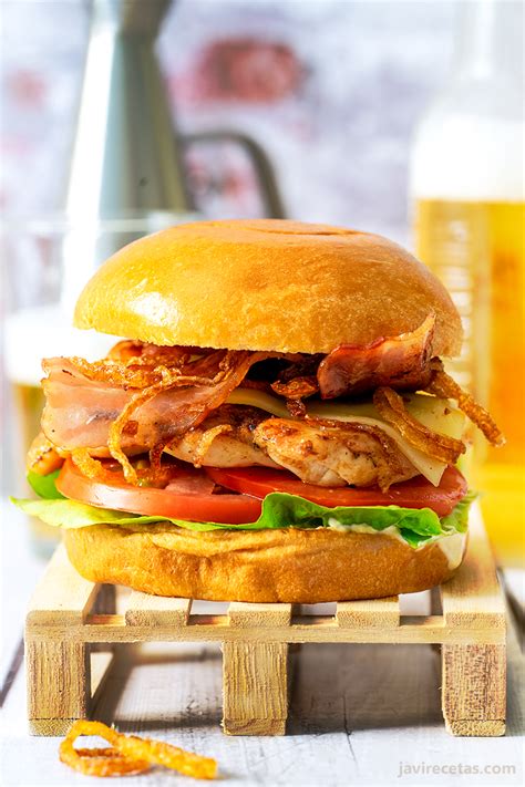 - Añade la hamburguesa de pollo, el bacon crujiente, el queso, los pepinillos, el tomate y la cebolla.