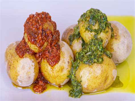 Papas arrugadas con mojo rojo y mojo verde, dos clásicos de la gastronomía canaria.