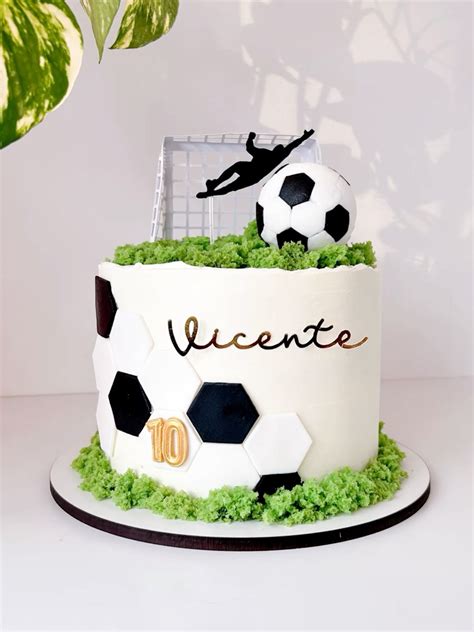 Empieza cubriendo la tarta con un glaseado verde que imite el césped. A continuación, utiliza pasta de azúcar blanca y negra para crear los hexágonos del balón que colocarás encima. Para las líneas y dibujos del campo de fútbol, una manga pastelera fina y buttercream blanco serán perfectos. No te olvides de los pequeños detalles, como las porterías, que puedes hacer con palitos de galleta.