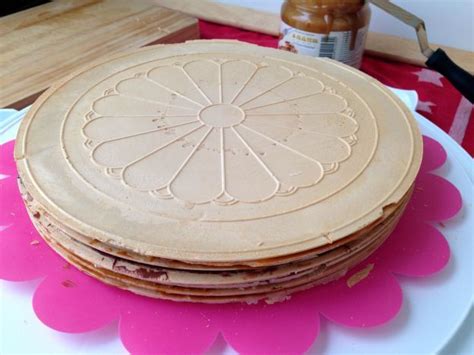 - Colocamos tres o cuatro obleas en línea, superpuestas ligeramente, y untamos la parte central con queso crema.