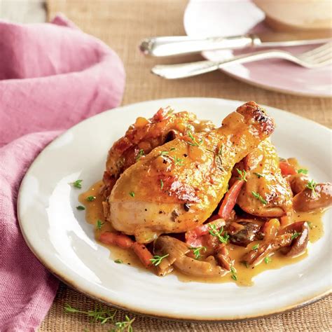 ¡Disfruta de este pollo guisado con setas y vino blanco, un plato que te transportará a los sabores de la cocina tradicional!