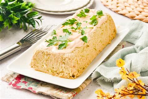 Para servirlo volcaremos el pastel sobre una fuente alargada. Por encima le pondremos la salsa de queso, y podemos poner unas hojitas de rúcula o de lechuga alrededor del pastel para decorarlo.