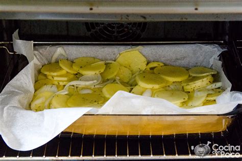 - Pela la cebolla y córtala en tiras finitas. Pon las patatas junto con la cebolla, mezcladas, en una bandeja de horno. La idea es que estén amontonadas en pocas capas. En las fotografías puedes apreciar la bandeja que he utilizado yo, si decides elaborar por ejemplo el doble te recomiendo utilizar una bandeja más grande para que no queden muy amontonadas y se cocinen bien.