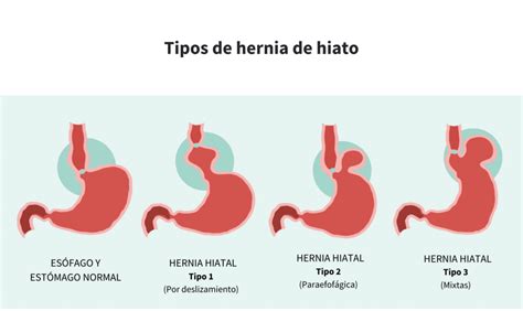 - Hernia de hiato paraesofágica: Esto es debido a que las zonas superiores del estómago se desplazan hacia la caja torácica.