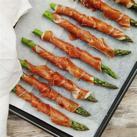 Elaboración: No ponemos cantidades exactas en esta receta, pues se puede elaborar con los espárragos que se desee. Sencillamente, debemos cortar la parte de abajo de los espárragos, más dura, y envolver cada uno en una loncha de jamón serrano.