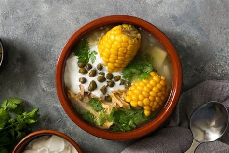 El ajiaco colombiano se caracteriza por ser abundante y reconfortante. Se trata de una sopa con una textura bastante cremosa que se elabora a partir de maíz, patatas y pollo y que se cocina durante mucho tiempo con el fin de que los ingredientes queden perfectamente integrados en el caldo otorgándole esa espesura tan característica.
