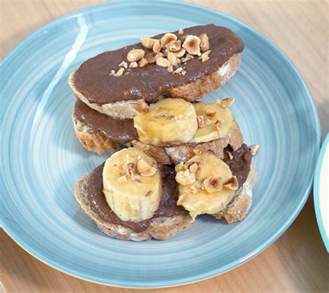 - Extiende una capa de crema de cacao sobre cada trozo de plátano.