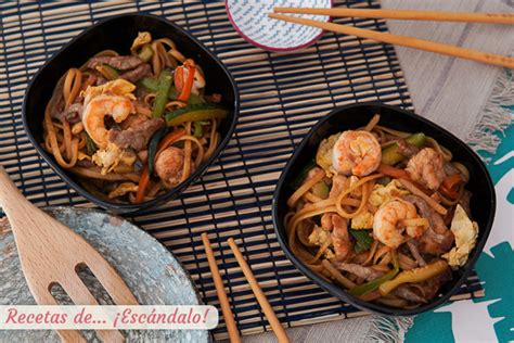 Estos tallarines quedan riquísimos y es un plato en el que se combinan de forma fantástica diversos sabores y texturas. Carnes, marisco, verduras y pasta se dan la mano y la clave está en cocinar cada cosa de forma ágil y solo el tiempo que necesita y aliñar con salsa de soja y salsa de ostras.