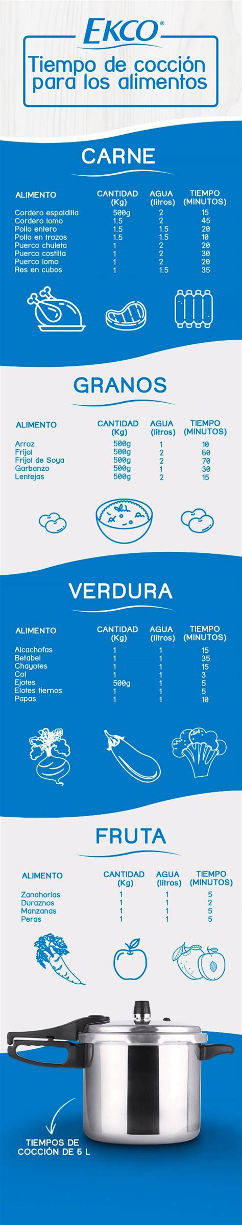 A continuación, se presenta una tabla con tiempos de cocción orientativos para diferentes tipos de alimentos en olla a presión: